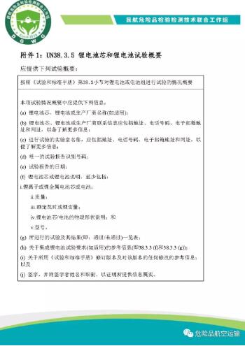 2019-2020版國際民航組織《危險物品安全航空運輸技術(shù)細(xì)則》規(guī)定,2003年6月30日以后生產(chǎn)的鋰電池芯或者鋰電池的制造商和隨后的銷售商必須提供聯(lián)合國《試驗和標(biāo)準(zhǔn)手冊》第三部分第38.3小節(jié)第38.3.5段規(guī)定的試驗概要(以下簡稱UN38.3試驗概要)。